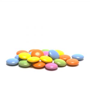 Ingredients: Sugar, Cocoa Mass, Cocoa Butter, Gum Arabic, Soy Lecithin, Corn Syrup, Carnauba Wax, Vanillin, Natural Coloring (Includes: Titanium Dioxide, Beta Carotene, Beet Powder), Artificial Coloring (Yellow 5, Blue 2). NOTE: PRODUCED IN A FACILITY WHERE MILK POWDER IS PRESENT – NOT RECOMMENDED FOR THOSE WHOM ARE ANAPHYLACTIC TO DAIRY. NOT A VEGAN PRODUCT.